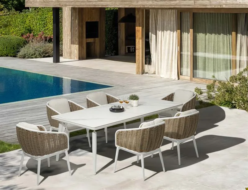 - Mesa de comedor Irvine 220×100 cm – aluminio blanco con top cerámico blanco
