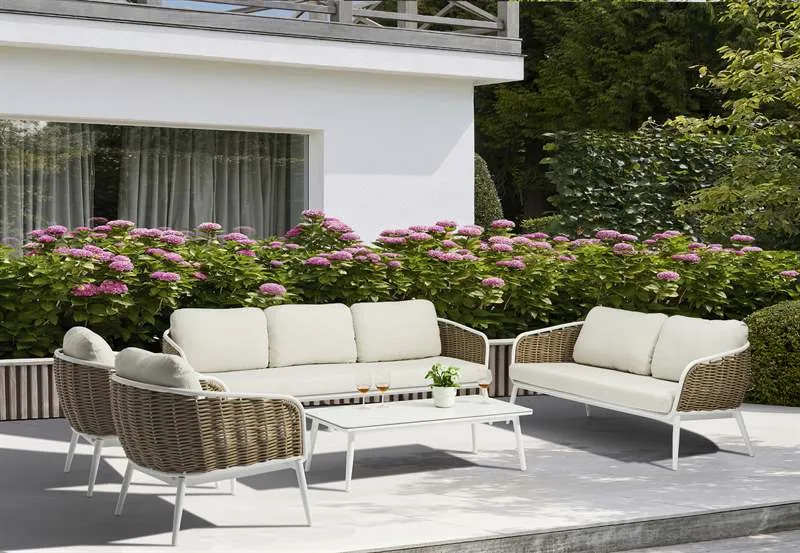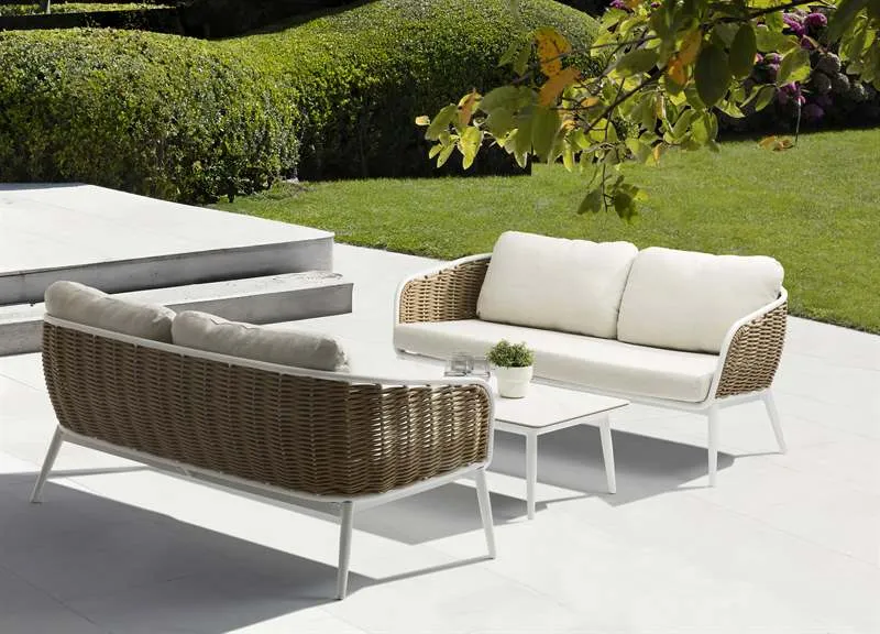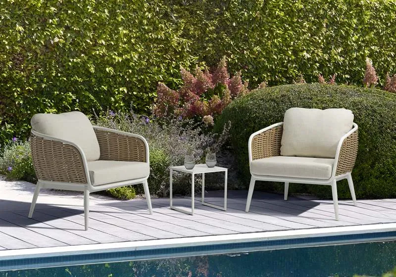 Combina Mobiliario de Diseño para el Jardín Colección Irvine con elementos en madera clara, plantas verdes y textiles en lino o algodón para acentuar su estilo natural y crear una atmósfera relajada, luminosa y sofisticada.