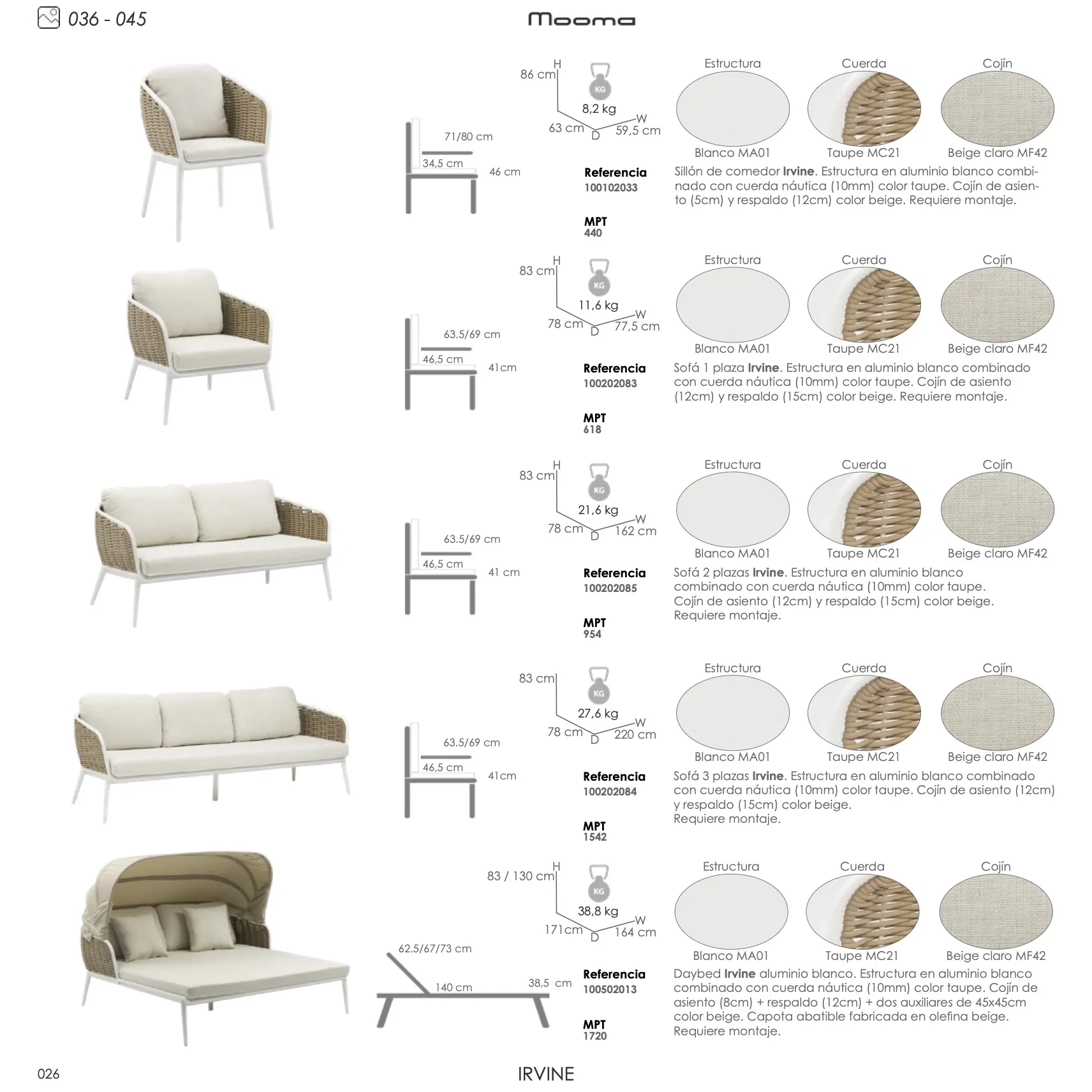 Descubre la Colección Irvine, una línea de mobiliario exterior que combina diseño contemporáneo, materiales resistentes y un encanto natural. Fabricada con estructura de white lacquered aluminium and details at cuerda náutica tejida a mano, esta colección aporta un estilo fresco, sofisticado y atemporal a cualquier ambiente exterior.