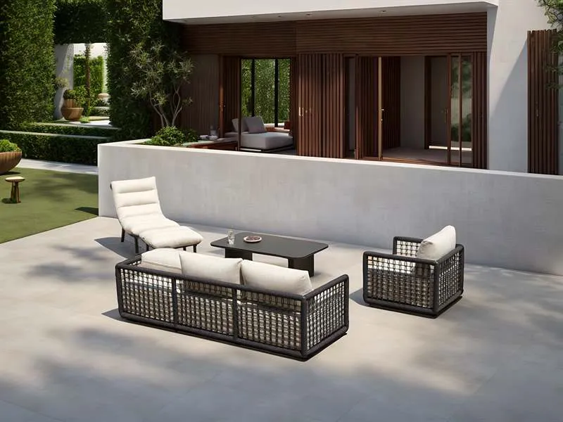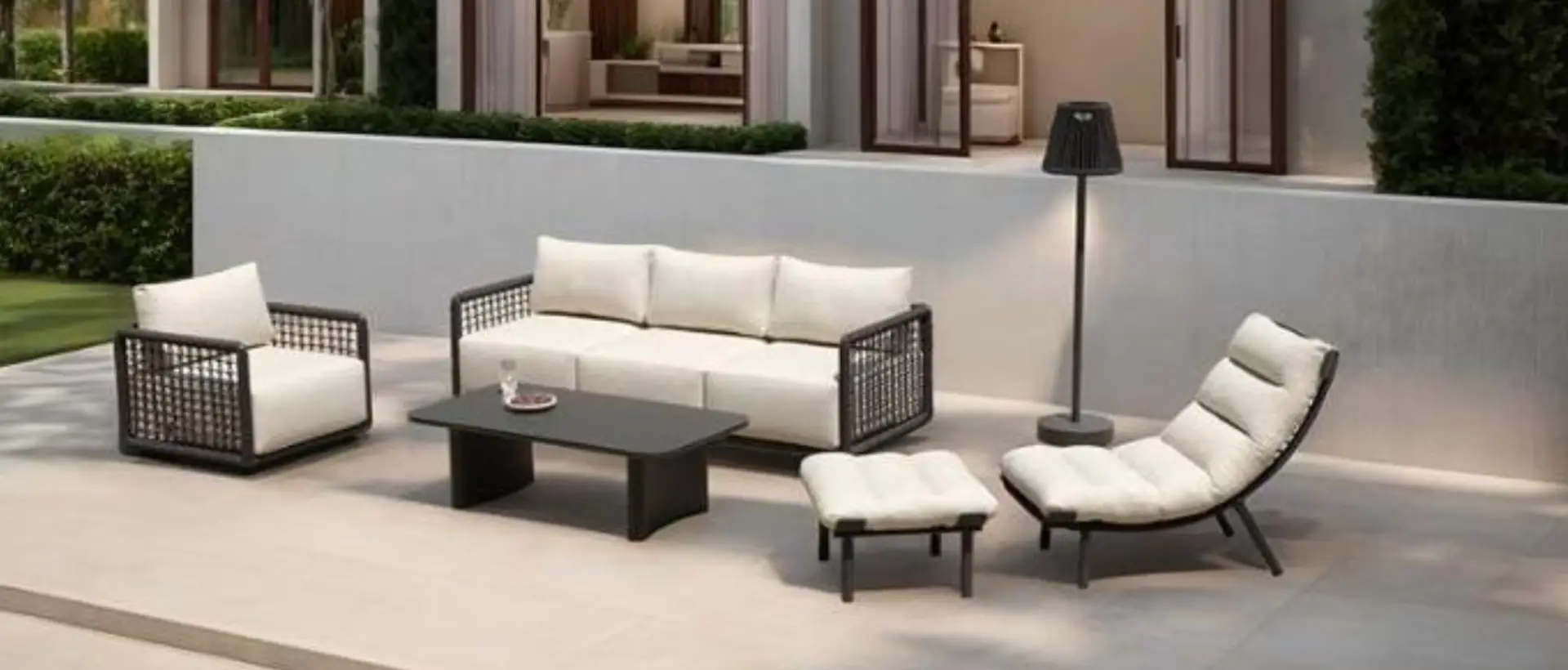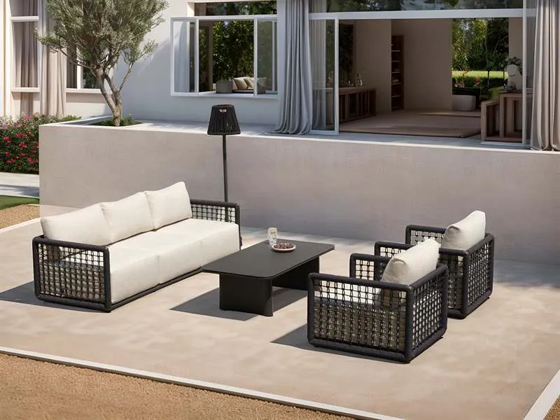 The Santa Ana Collection stands out for its natural elegance and contemporary lines. Its structure in matt black aluminium, combined with anthracite braided rope, The cushions, in a sophisticated contrast with the ivory-coloured technical fabric, The new range of products is designed to bring warmth and distinction to any outdoor environment.