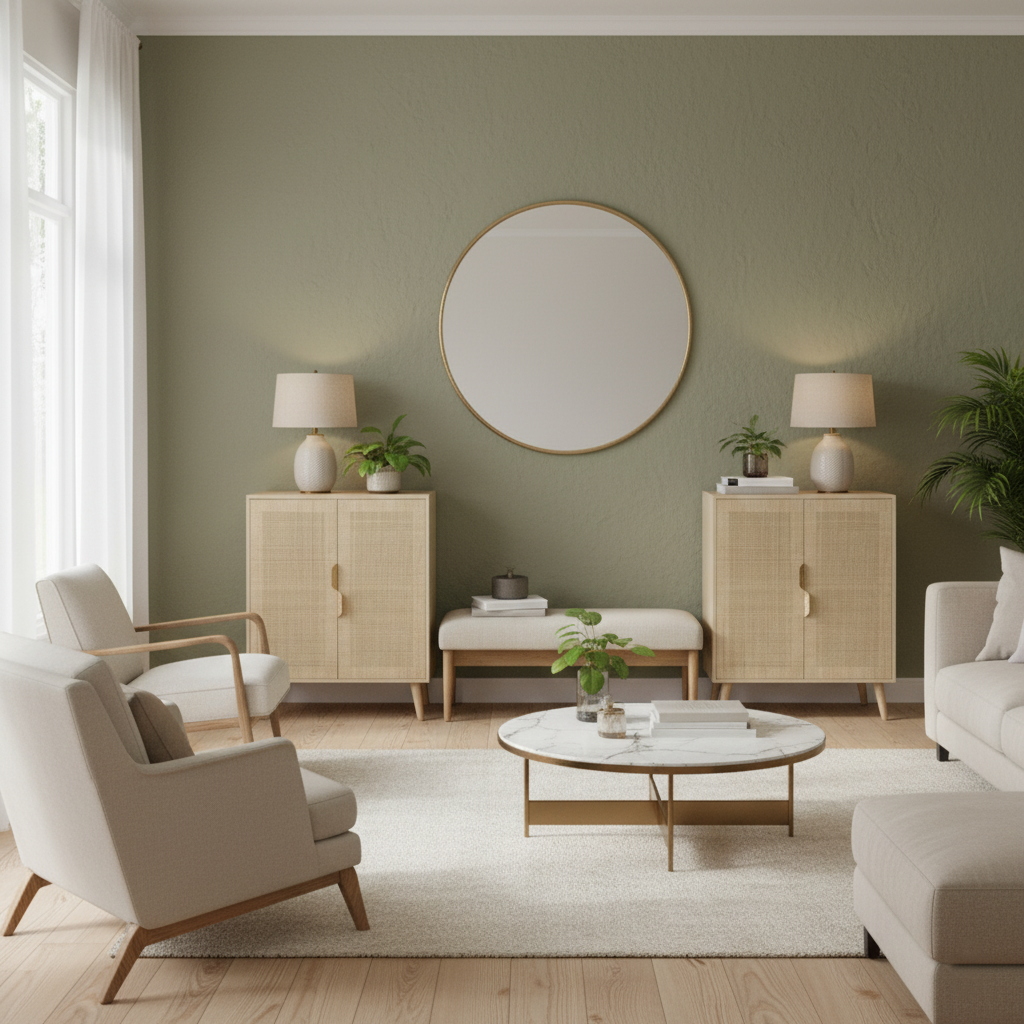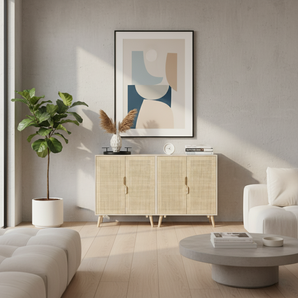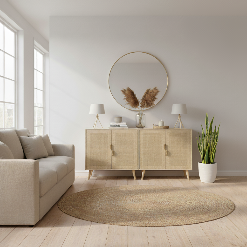 Un aparador de madera y rattan que combina diseño natural con funcionalidad: aporta calidez y estilo al espacio mientras ofrece gran capacidad de almacenamiento.