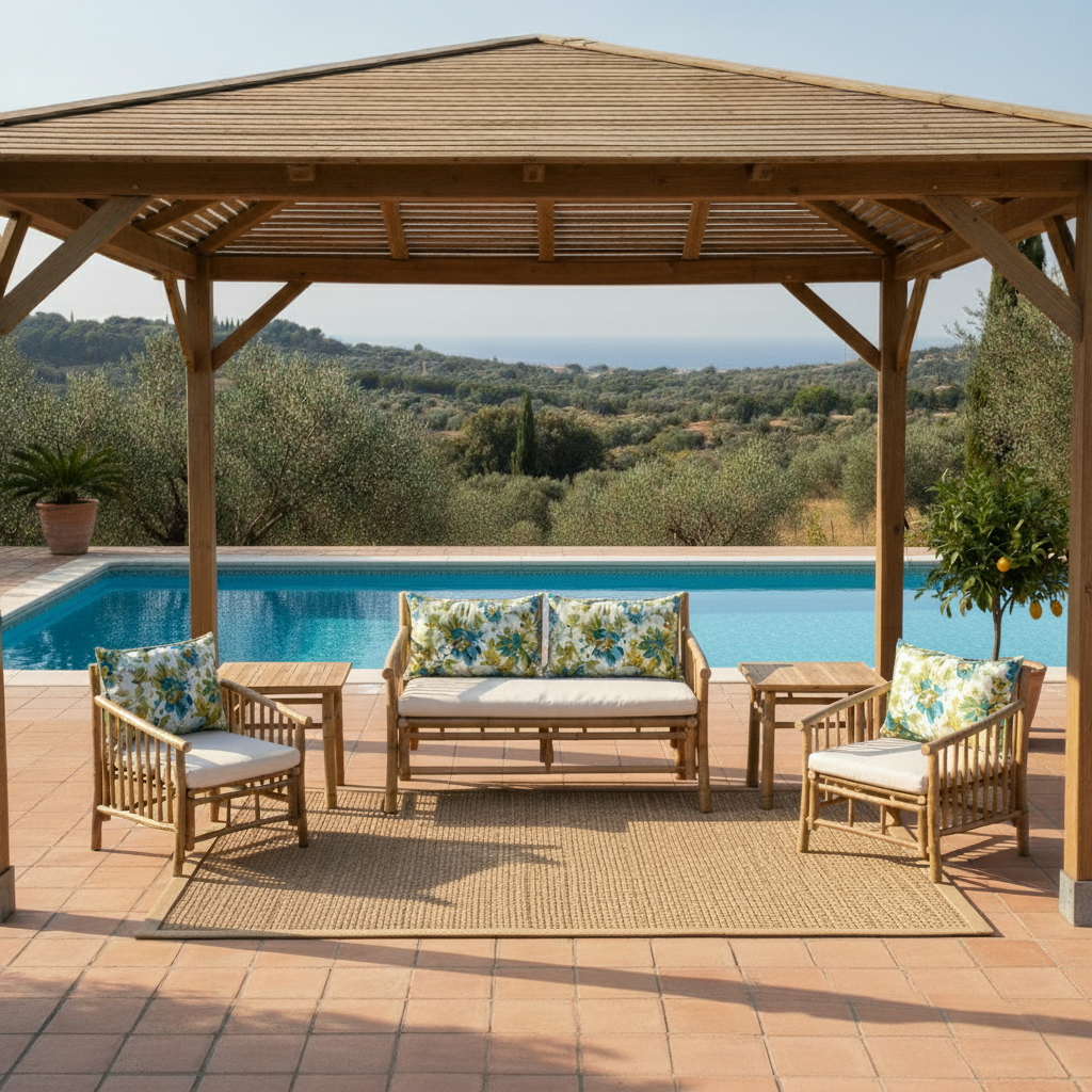 Conjunto de 5 piezas en bambú rústico y cojines de algodón.