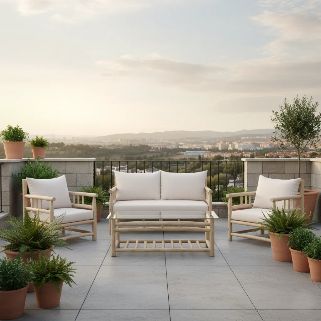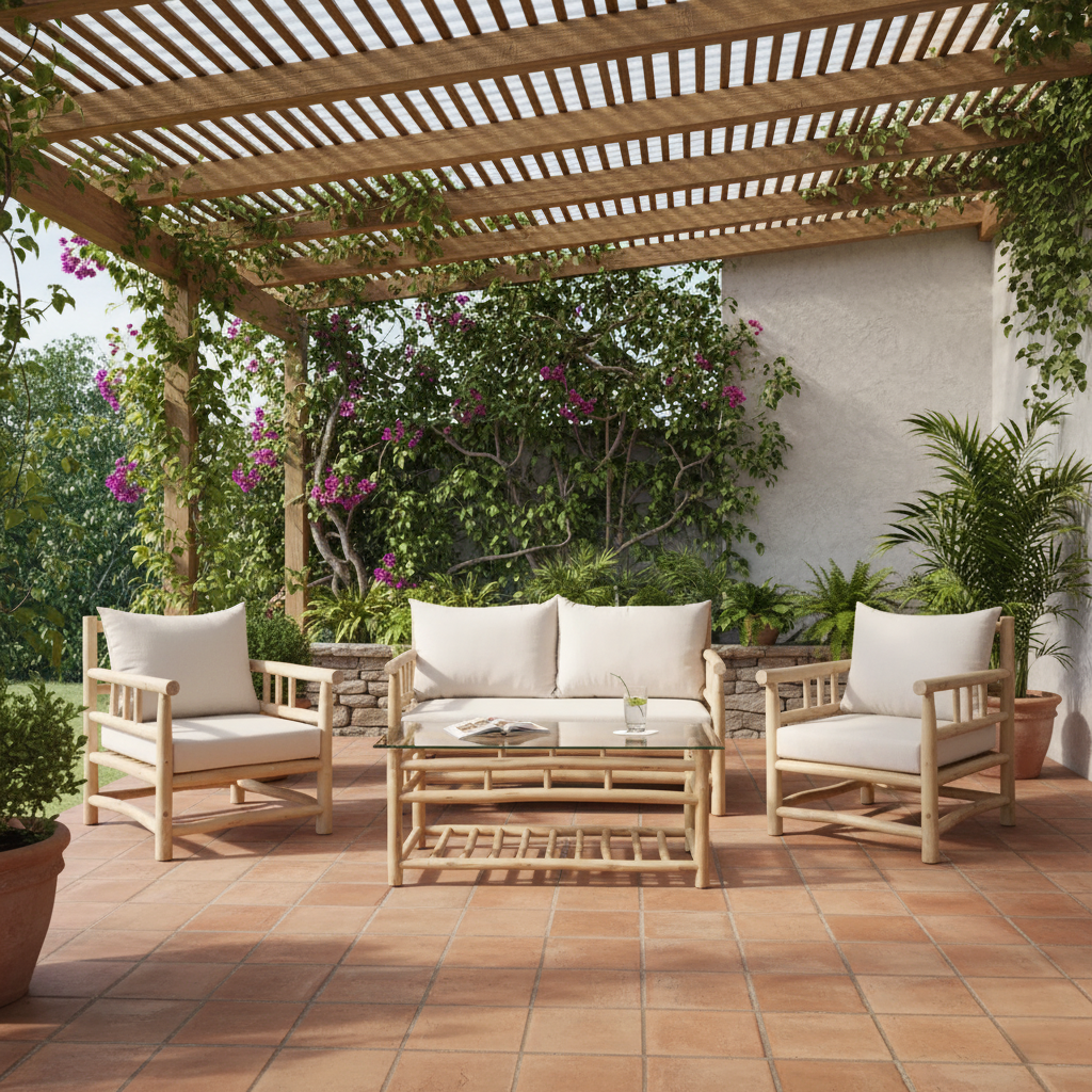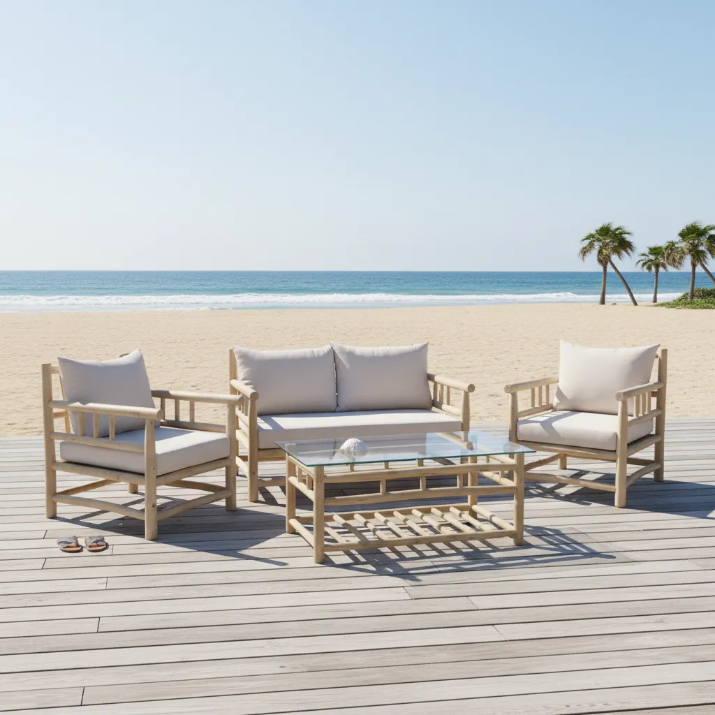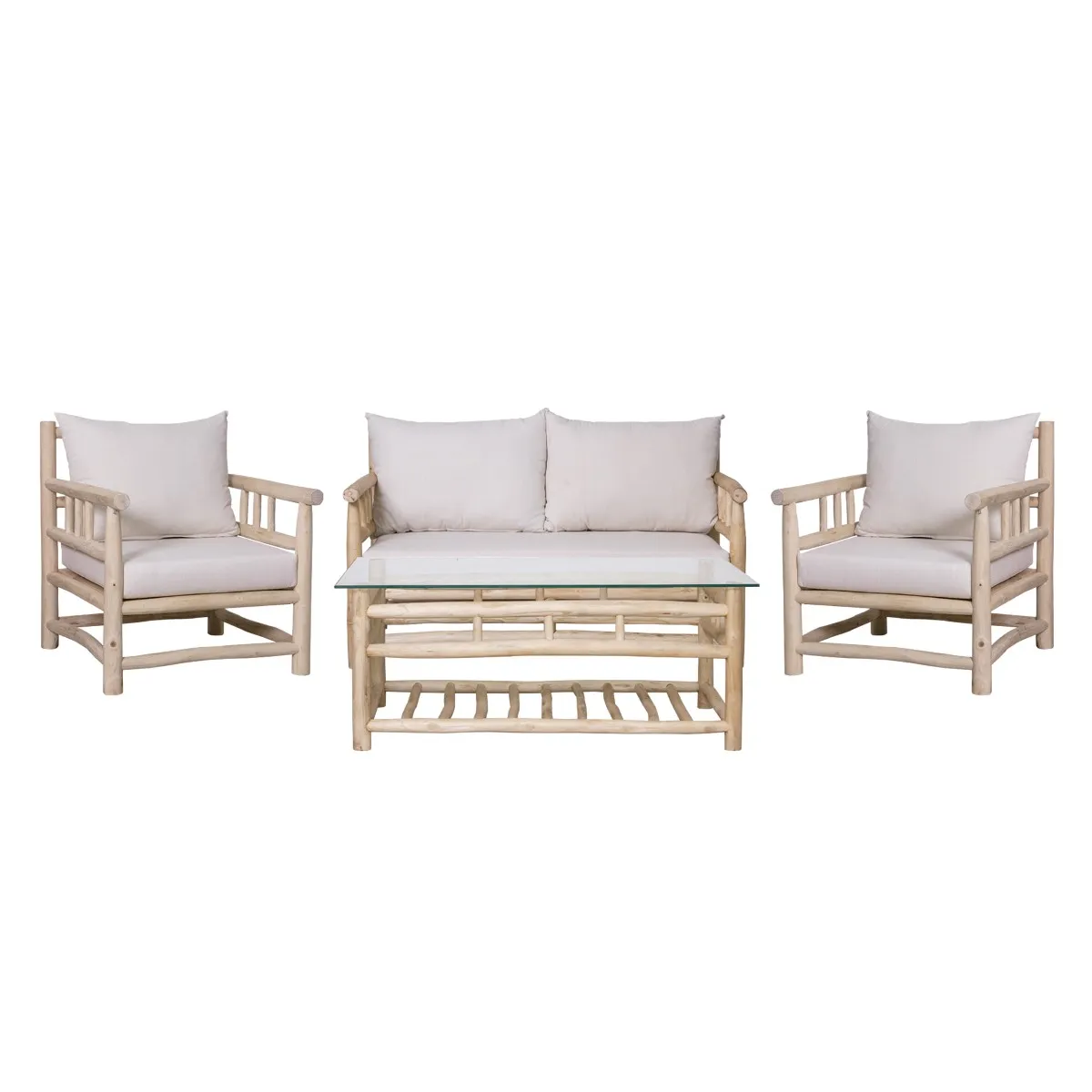 Este conjunto de terraza combina madera de teca maciza y cojines de algodón para ofrecer confort, estilo y resistencia. Incluye un sofá de 2 plazas, dos sillones individuales y una mesa de centro con cristal, creando un ambiente elegante y acogedor en cualquier espacio exterior.
