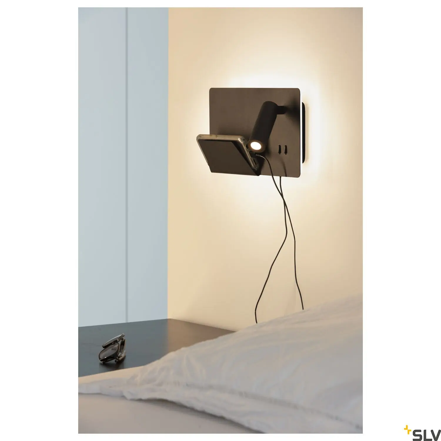 Luminárias de leitura dupla (SPOT/FLEX) com USB, suporte para smartphone e versão esquerda/direita, para quartos inteligentes e funcionais.